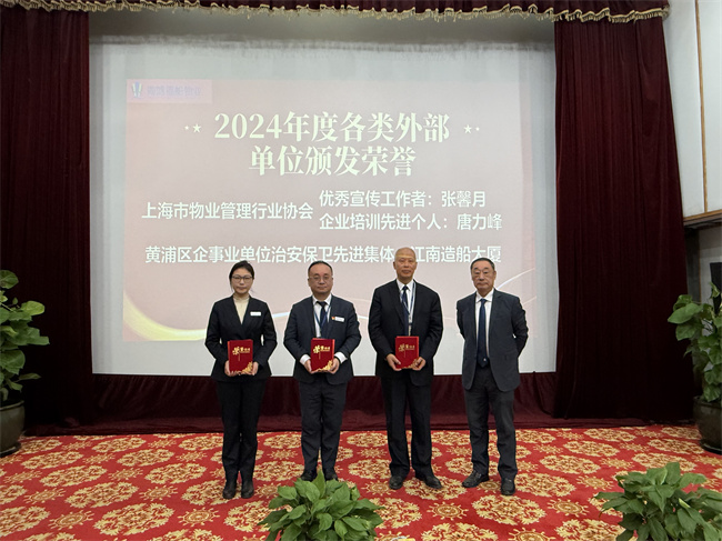 在全體干部、員工努力下,海鴻福船物業(yè)在完成2024年度經(jīng)營管理目標的同時,獲評全國物業(yè)服務綜合實力百強、上海市物業(yè)服務行業(yè)五星企業(yè)、上海市物業(yè)服務綜合實力百強、首屆楊浦區(qū)質量金獎等多項榮譽。江南造船大廈等6個項目獲得上海市2024年至2026年物業(yè)管理優(yōu)秀示范項目稱號。為表彰先進,樹立榜樣,本次會議還頒布了公司2024年度先進表彰決定。